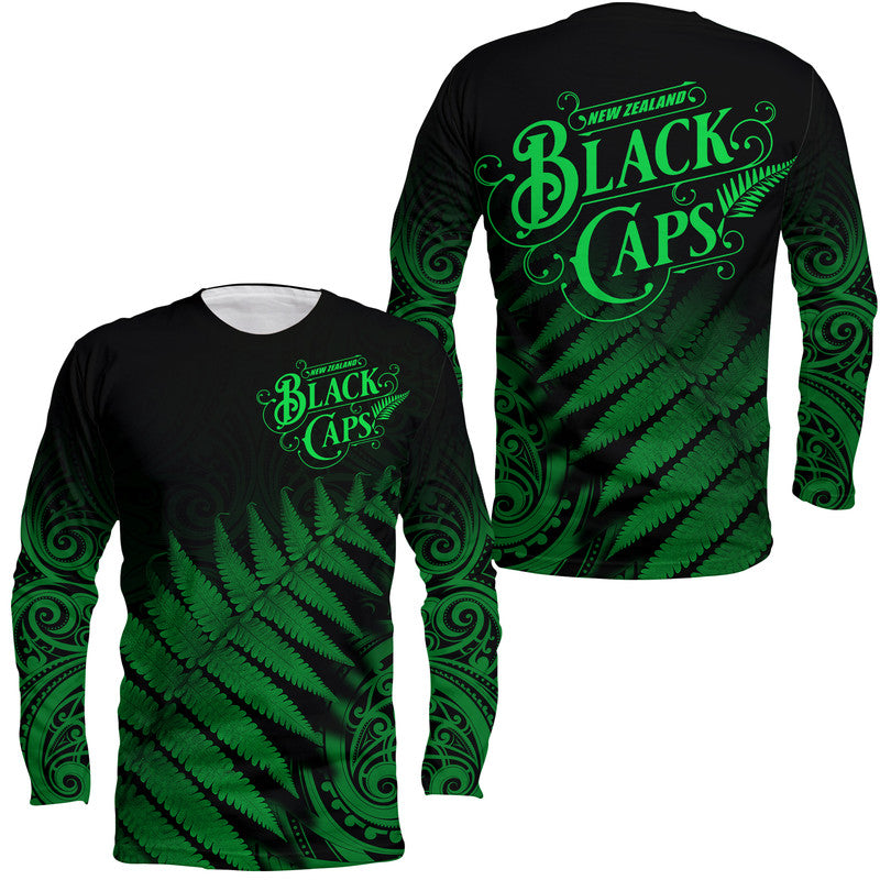 New Zealand Kiwis Cricket Team Long Sleeve Shirt Black Caps Silver Fern Mixed Maori Pattern Version Green LT9