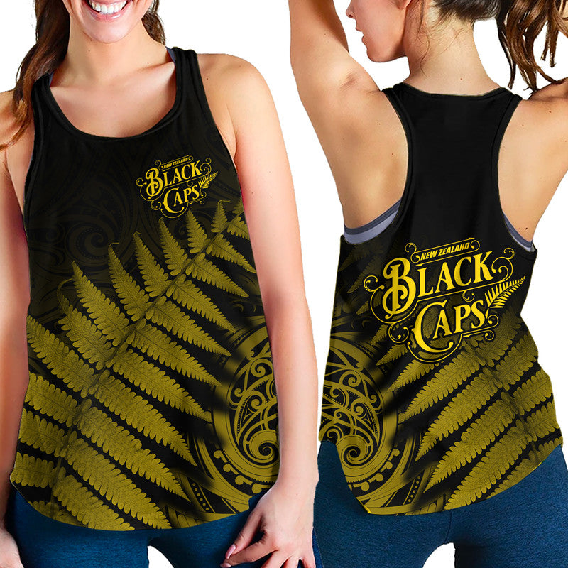 New Zealand Kiwis Cricket Team Women Racerback Tank Black Caps Silver Fern Mixed Maori Pattern Version Gold LT9