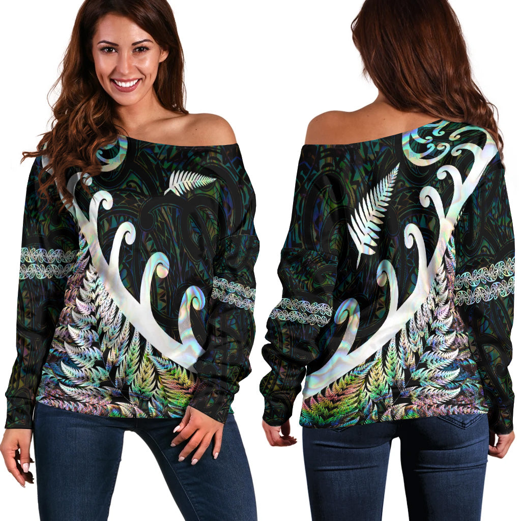 New Zealand Rugby Maori Women Off Shoulder Sweater Silver Fern Koru Vibes - Paua Shell LT8
