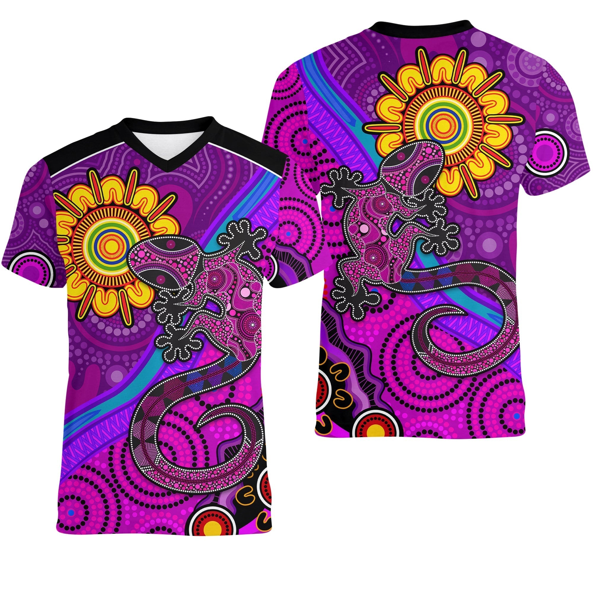 Australia Lizard and Sun V - Neck T shirt Aboriginal Art Purple LT13