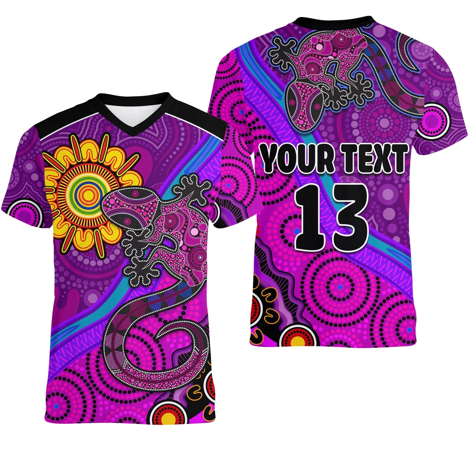(Custom Text and Number) Australia Lizard and Sun V - Neck T Shirt Aboriginal Art Purple LT13
